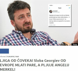 13. april 2018 – Informer objavljuje tekst pod nazivom Ljiga od čoveka! Sloba Georgiev od Evrope mlati pare, a pljuje Angelu Merkel.