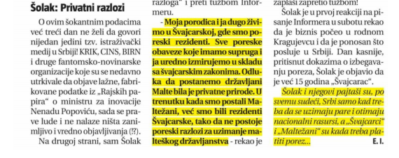 U svom novom tekstu autor E.I. naziva BIRN, CINS i KRIK „takozvanim istraživačkim medijima“ i „fantomsko-novinarskim organizacijama koje su se nedavno utrkivale da objave lažne, fabrikovane podatke iz “Rajskih papira”…“