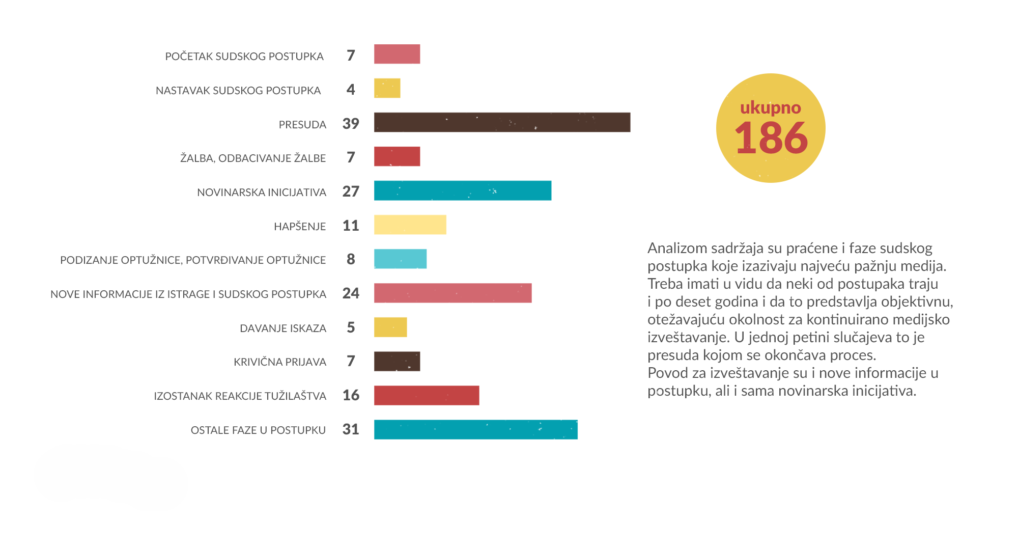1. Mediji nesrazmerno malo izveštavaju o sudskim postupcima za organizovani kriminal i korupciju, imajući u vidu raširenost ovog problema u društvu. Dodatna poteškoća je i okolnost da sudski postupci traju jako dugo (neki čak i više od deset godina) što u velikoj meri otežava kontinuirano medijsko praćenje.